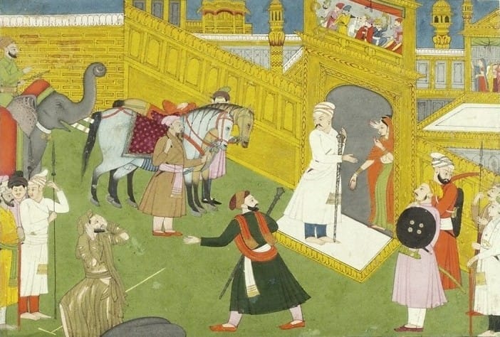 కుచేల (Kuchela) entered Dvaraka, a city of many gates, and was amazed by its beauty and opulence of its streets and buildings. He wandered through the streets mustering courage to approach the palace. He was humbled and wasn’t sure if his friend కృష్ణ (Krishna) would remember him and even if he did whether he would grant an audience. He entered the palace and escorted to కృష్ణ (Krishna) resting on a couch with his queen, Rukmini. కృష్ణ (Krishna) was overjoyed to his friend కుచేల (Kuchela). He immediately got out of his seat to welcome his friend and so did Rukmini. He offered his own seat to his friend. He summoned his servants to bring water and a platter. He asked his friend to rest his feet on the platter and washed his feet. He then poured the water from the platter on his head as a sign of respect. He smeared కుచేల (Kuchela)’s body with pastes and perfumes as per the custom to honor a guest. Rukmini assisted her husband as he offered కుచేల (Kuchela) a number of refreshments.