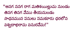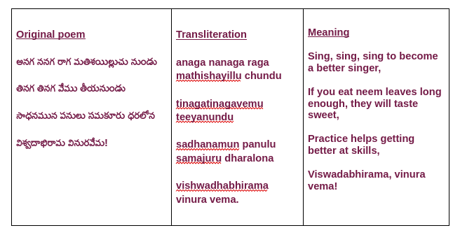 This poem emphasizes the importance of practice to learn and improve a skill. If you want to improve your singing, you have to practice several times. You have to put in the work to get better at doing things. I worked hard to improve my handwriting after I heard this poem from నానమ్మ (Nanamma). I am glad she passed on the wisdom of వేమన (Vemana) to her next generation.
