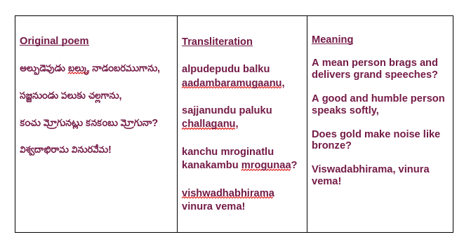 This poem talks about how one can’t measure a person by how they talk. A good person is humble and modest. A mean person on the other hand is flashy and prone to bragging. వేమన (Vemana) asks if gold is noisy like bronze, comparing gold to a good person and a mean person to bronze. He uses poetry to convey important information very effectively in a subtle form. He doesn’t say gold is like a good person. He prompts his readers to infer that by asking a question to get them to think. Whenever I come across someone bragging about their wealth, I hear అమ్మ (Amma) saying “కంచు మ్రోగునట్లు కనకంబు మ్రోగునా?” in my head.