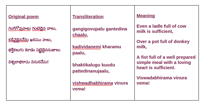 This poem talks about the benefits of a well prepared simple meal with a loving heart. వేమన (Vemana) compares a ladle full of cow milk to a pot full of donkey milk to illustrate his message. Eating a simple meal prepared with love is like drinking a ladle full of cow milk. He is urging his readers to look at the quality over the quantity. Whenever I hear this poem, I almost gag at the thought of drinking donkey milk.