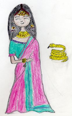Madhava came back and sat in the princess's bedchamber with his sword ready. He was very vigilant looking for anything unusual. The clock was ticking and hours went by. During the early hours of the morning, Madhava saw a large snake emerging out of the princess’s mouth. The snake slithered out and helped itself to a pitcher of milk sitting on a side table. After drinking the milk, the snake went back to where it came from. The table was very close to the princess's bed and Madhava didn’t want to take any chances trying to kill the snake. The routine repeated the next night with milk placed on a table far away from the bed. Madhava was able to kill the snake. Once the snake was killed, the princess recovered. The king kept his promise. Madhava and the princess lived happily ever after.