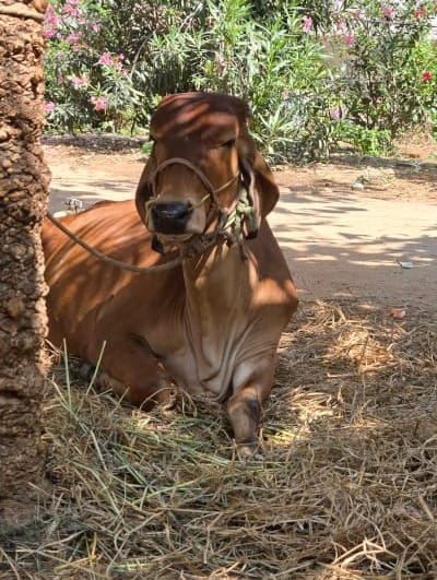 Cows are majestic. It's fascinating to watch them lift their hind legs to scratch their heads and swat flies away with their long tails. They look at you with their large eyes. On a recent visit to India I spent a few days on my aunt’s farm watching a pregnant chocolate brown cow and her one year old brown calf. Mom is fully pregnant waiting to give birth. I watched in awe as she effortlessly and slowly lifted her hindleg balancing on her three legs as she scratched her head with the lifted hind leg. You could tell she was being very careful and deliberate with the movements because of her bulging pregnant belly.