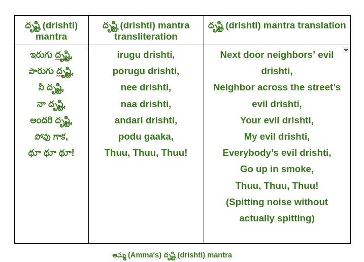అమ్మ (Amma) was proud of my long black hair and took great care of it. She very much enjoyed the praise and adoration from people who would say how beautiful and long my hair was. However, the praise came with a price. She thought all of this attention and దృష్టి (drishti) was bad. దృష్టి (drishti) means sight in Telugu, however it also means, “evil drishti or bad drishti”. Almost all Indian languages have a name for the concept of దృష్టి (drishti). In Hindi it is बुरी नजर (buri nazar), bad sight. When people admired my hair, clothing, or how I looked, అమ్మ (Amma) would politely thank them. As soon as we got home, she would be ready for her దృష్టి తీయడం (drishti teeyadam) ritual which means removing the ill effects of the దృష్టి (drishti) or bad drishti. She was armed with two types of దృష్టి తీయడం (drishti teeyadam) rituals, one for minor దృష్టి (drishti) incidents at a lower Richter scale and a second elaborate one for major ones.