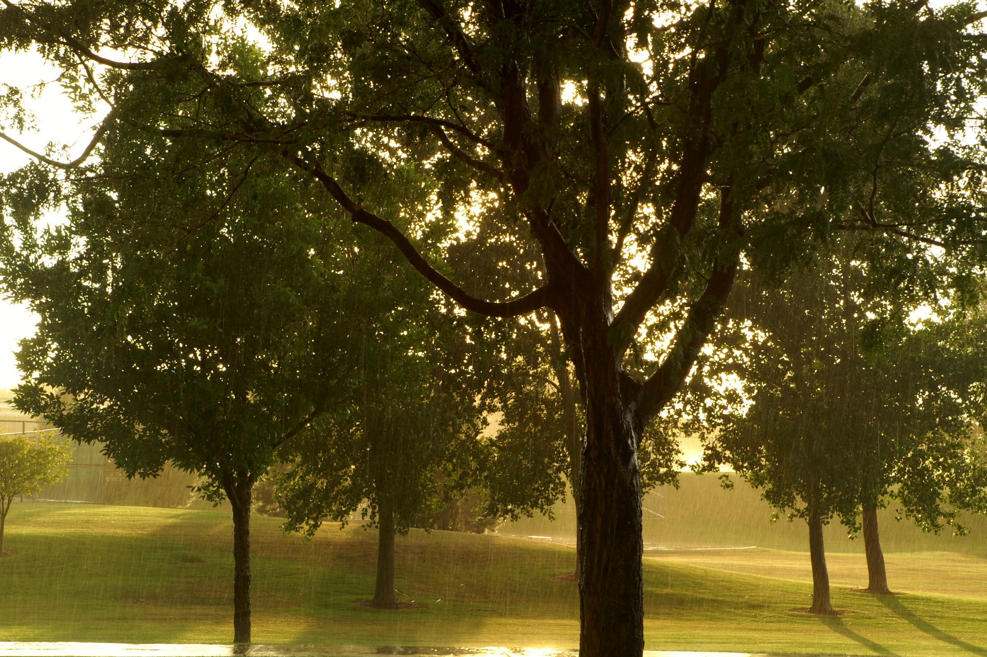 I stepped out to run an errand into a sunshower. It was hot and sunny just a few minutes ago and now wind was blowing hard and raindrops were glowing brilliantly as they fell failing miserably in their attempt to wet the ground. The sunshower is a contradiction of sorts as this meteorological phenomenon leads to a rainfall while the sun is shining without a cloud in the sky when a distant rain storm blows the airborne raindrops into an area. At times a single rain shower cloud is the culprit, passing overhead, and the Sun's angle keeps the sunlight from being obstructed by the clouds overhead. There is a higher possibility to see a beautiful rainbow after a sunshower.